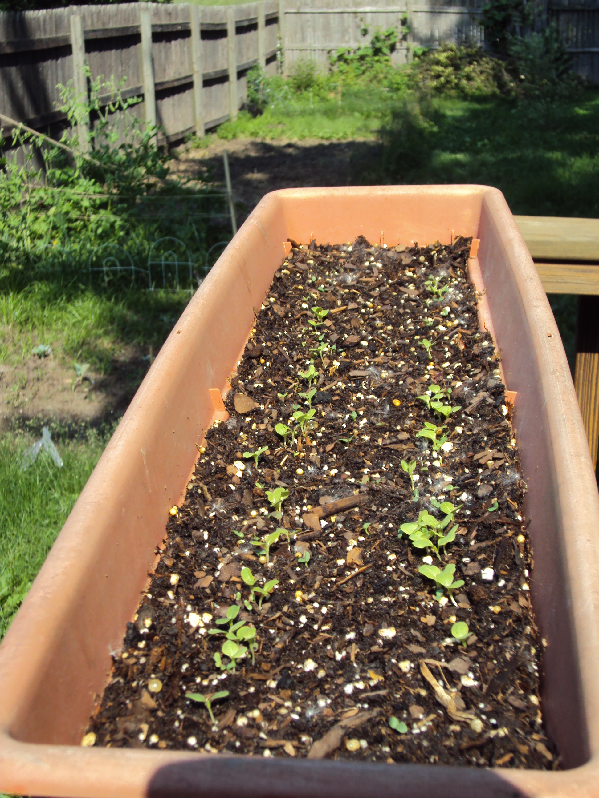 Then there is the pot in which I planted basil seeds. These were planted on June 4th. I seeded a bit heavier than I probably need to to since the seed was from 2009. As seeds get older their germination rate drops. Apparently the basil didn’t realize that it was from a few years ago. Some seeds keep their viability longer than others. Usually I just increase the amount of seed I use if it’s older seed. If you have leftover seed from this year and would like to save it until next year, store in a cool dry place.