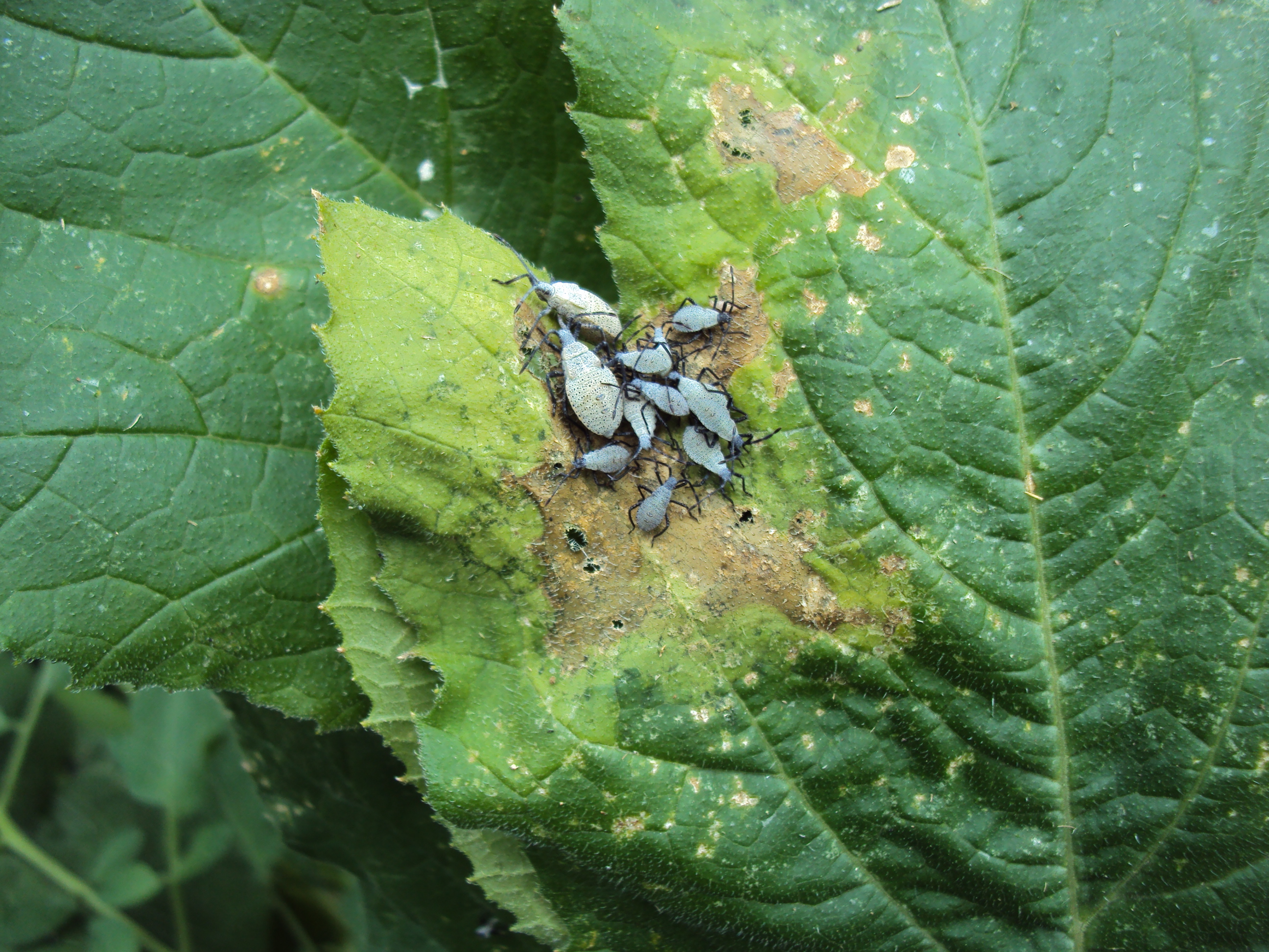 A huge cluster of immature squash bugs. I was not happy. They cause the brown dead areas you see in the picture. If you don’t get a population under control they can really reduce production or kill the plant. As with many bugs, it’s easier to control them when young when they are more susceptible.