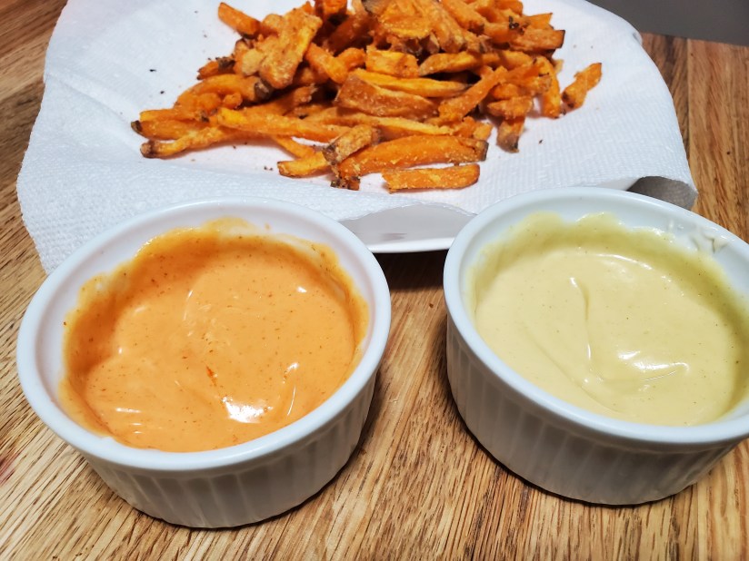 We love our air fryer french fries and instead of just ketchup to dip them in, we sass it up. My favorite is our Maple Dijon Mayo while my other half prefers his Siracha Mayo. Both are simple, but the key to any good dipping sauce is getting the ratio right. With the Siracha Mayo, if you don’t like spicy, start with less Siracha and add more to taste, if you like spicy, start with what I’ve listed below and add more if desired.